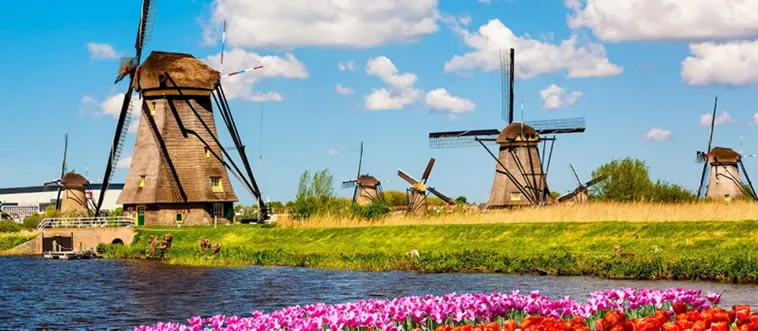 The Windmills of Kinderdijk, a network of 19 historic mills, manage water in a low-lying landscape. Which country?