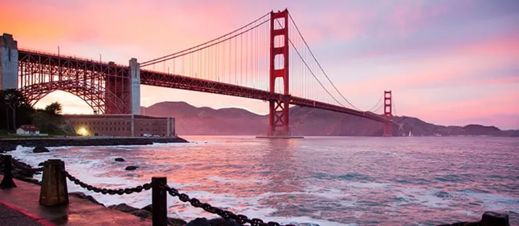 The Golden Gate Bridge, an orange suspension span over a bay, connects a city to marin lands. Which country?