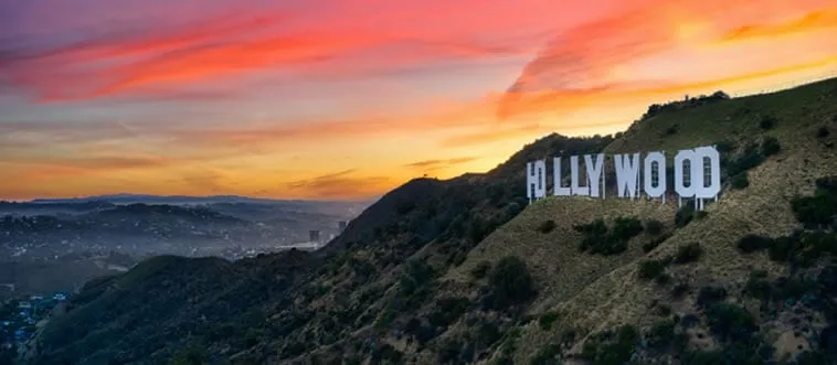The Hollywood Sign, white letters on a hillside, represents the entertainment industry. Which country?