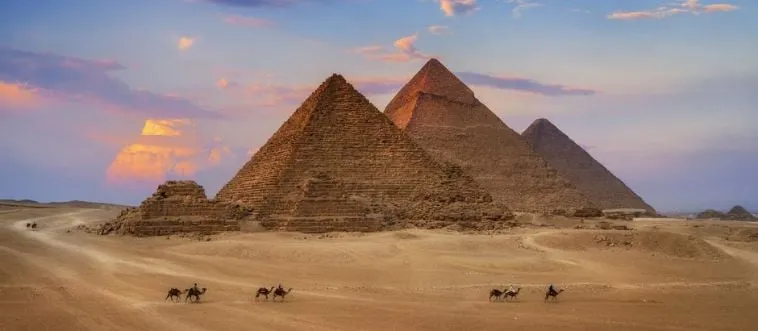 Which city borders the ancient Pyramids of Giza?