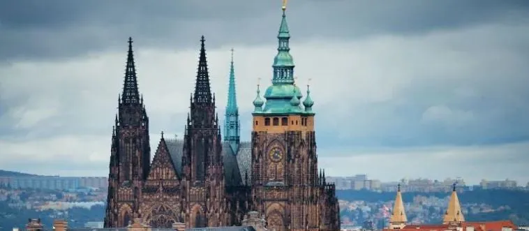 Which city crowns Prague Castle over Vltava River?