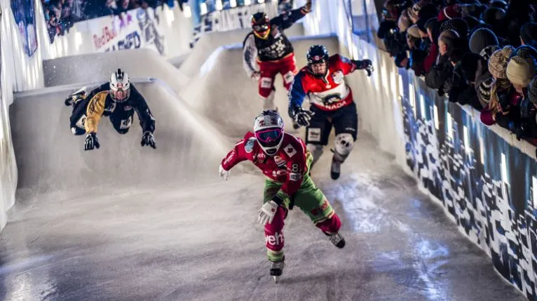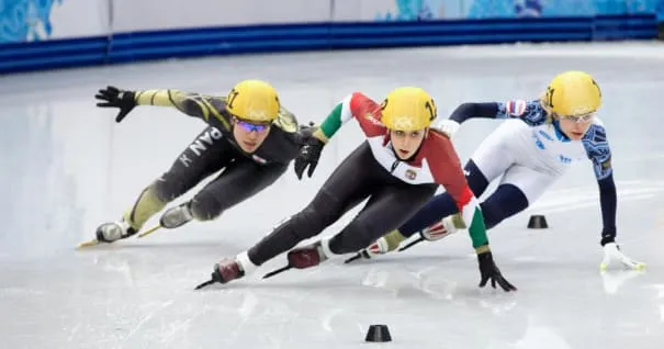 Which winter sport involves racing on a frozen track with spiked shoes?