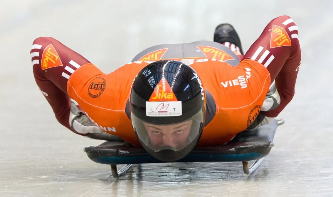 What is the name of the sledding sport that requires riders to travel headfirst with their faces just inches above the icy course?
